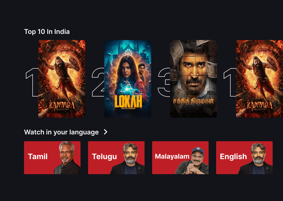 I redesigned the entire home screen from scratch — starting with wireframes, building a style guide, and developing a component-based system including movie cards, hero banners, trending cards, genre filters, and language selectors.